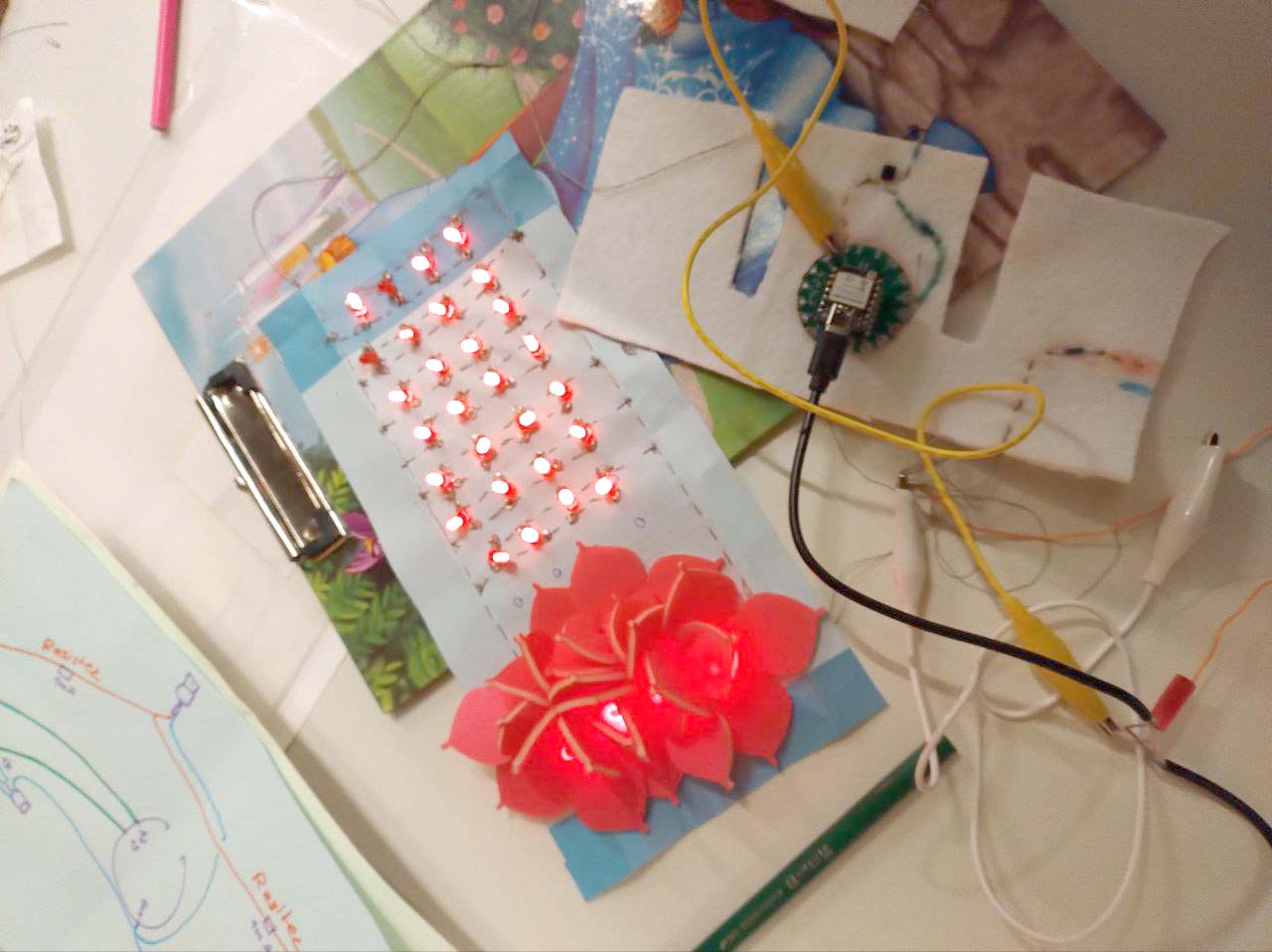 I have developed and collaborated on a range of workshops exploring electronics, especially e-textiles. In some sessions participants created experimental analog circuits using thermochromatic ink, simple LEDs, or vibration motors, as well as more digital workshops introducing the basics of physical computing and programming with Arduino and various sensors and components. I’ve also mentored student projects that grew out of these sessions.