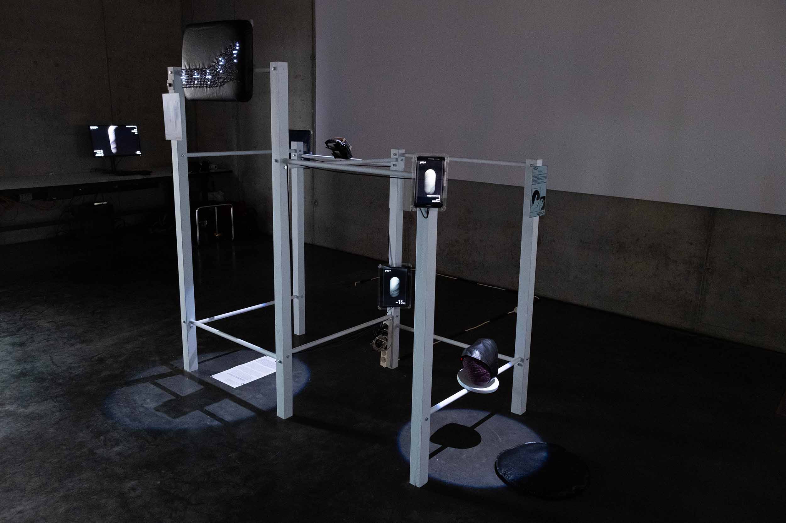 The research culminated in an artistic installation, temporarily bypassing the rules of a data-hungry economy. In a three-station parkour, visitors encounter unconventional biometric data trackers encouraging playful and confident interaction. Throughout the exhibition, visitors‘ data is displayed in real-time on screens. In the morning, the visuals start as a clear and simple dashboard of the visitors‘ information. With every collected data point the display becomes more distorted and the dashboard is increasingly overlaid by a visual animation that reflects the fragmentation of bodies by their data.